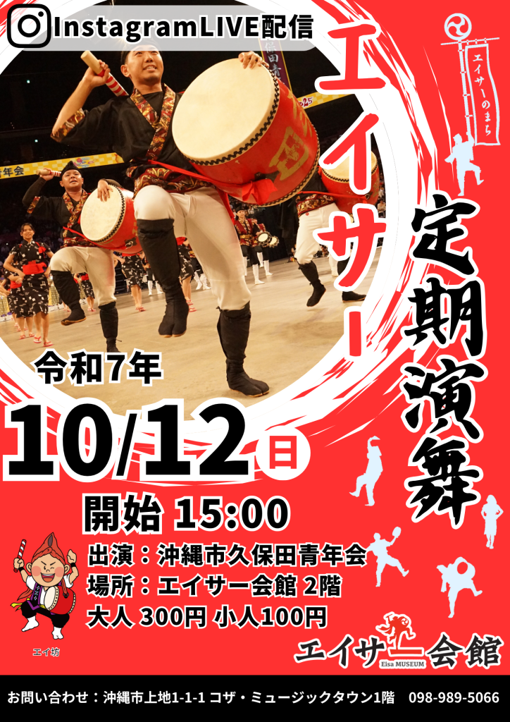 エイサー定期演舞のお知らせ 10月12日15時沖縄市久保田青年会 Posted on 2025年10月7日2025年10月7日 エイサー定期演舞:沖縄市久保田青年会 日時:令和7年10月12日15時開始場所:エイサー会館2階入館料金:大人300円 小人100円